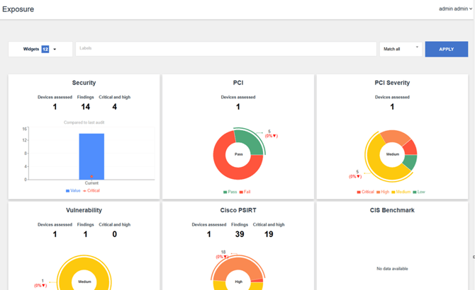 The Exposure page in Nipper OmniSight provides a high-level visual summary of your device assessment results. It is designed to help you quickly understand the overall security and compliance posture of your environment.