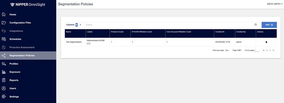 This list displays all Segmentation Policies that have been created and are ready for assessment; because the stored data contains sensitive information and is securely non‑retrievable, policies cannot be amended, but you may remove an existing policy and create a replacement if changes are required.