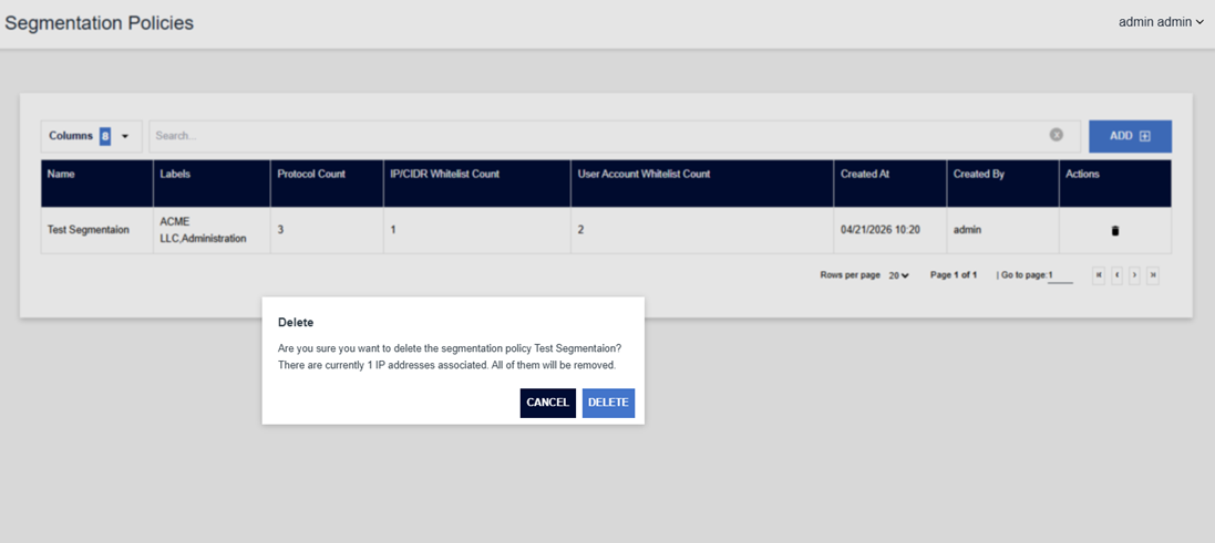 Segmentation Policies can be removed by selecting the Delete icon in the Actions column of the Segmentation Policies list. You will then be prompted to confirm that this is the policy you intend to remove before the deletion is completed.