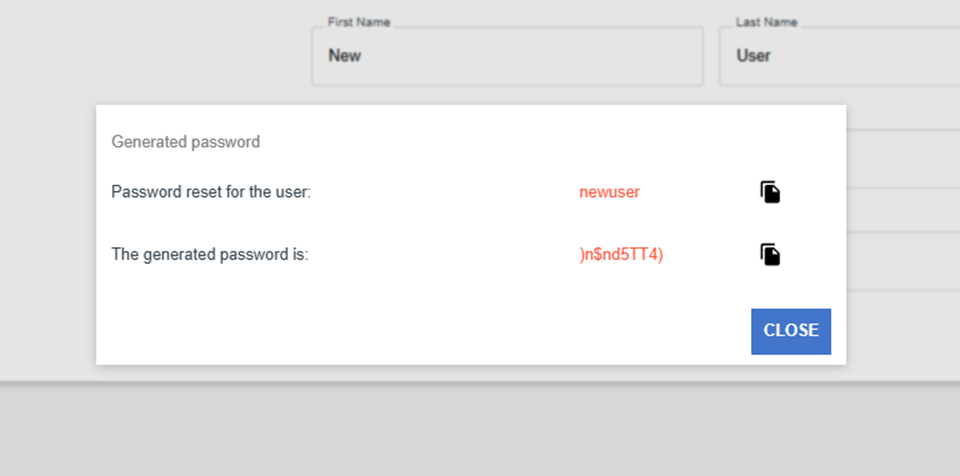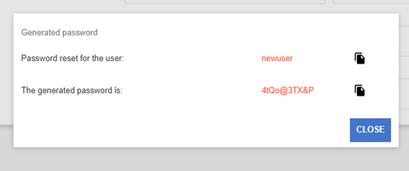 If you reset a user’s password, you will see a window with a generated password. Here you can copy the username and password to your clipboard by clicking on the Clipboard icons to the right of the fields.