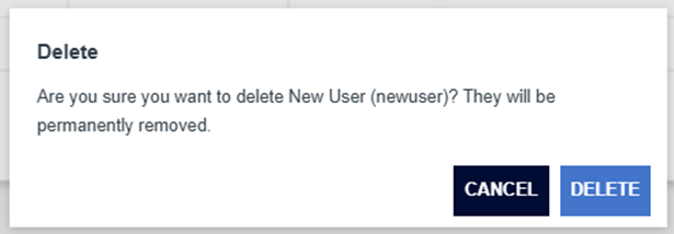 Clicking this delete button will prompt a deletion confirmation dialog, clicking Delete will remove the user, whereas clicking Cancel will navigate back to the Users table.